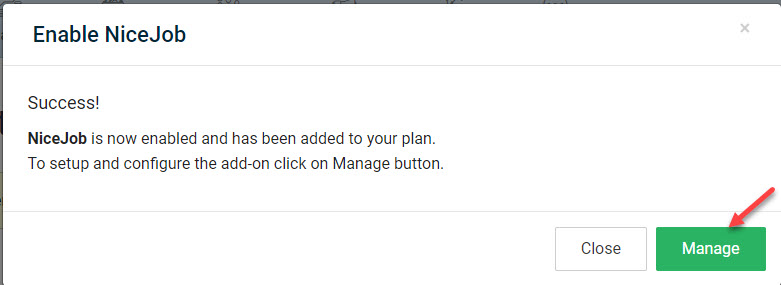 Once the NiceJob connector is enabled, a pop-up appears where you can set up and configure by clicking Manage.