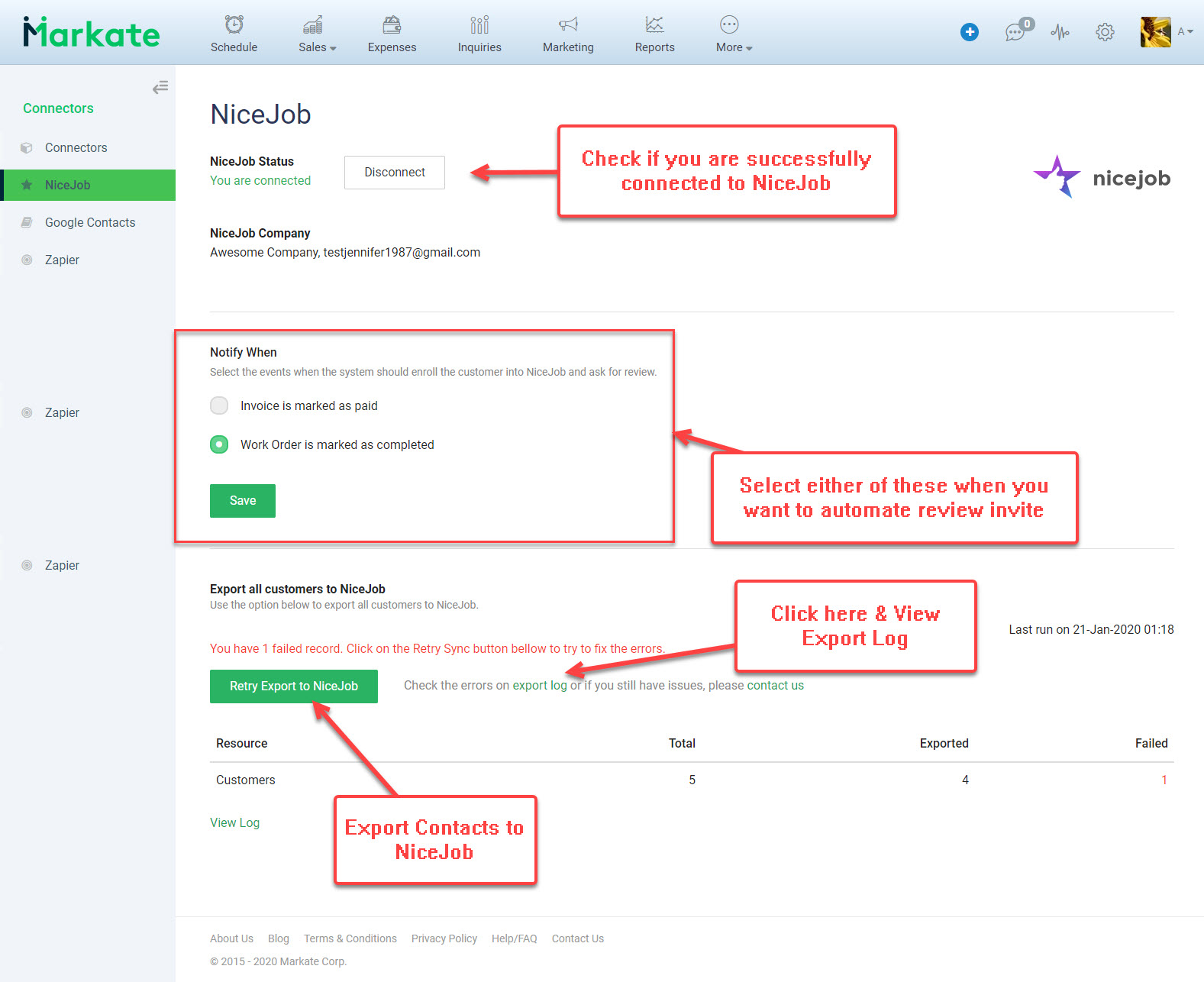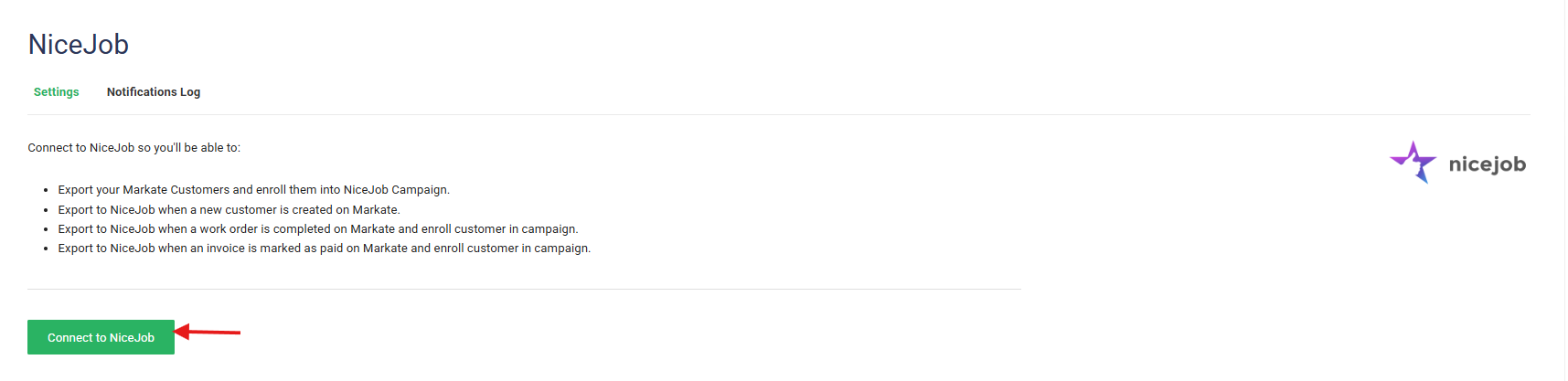 You can manually export all existing customers from Markate to NiceJob by clicking Export to NiceJob. Your newly added customers will be automatically exported.
