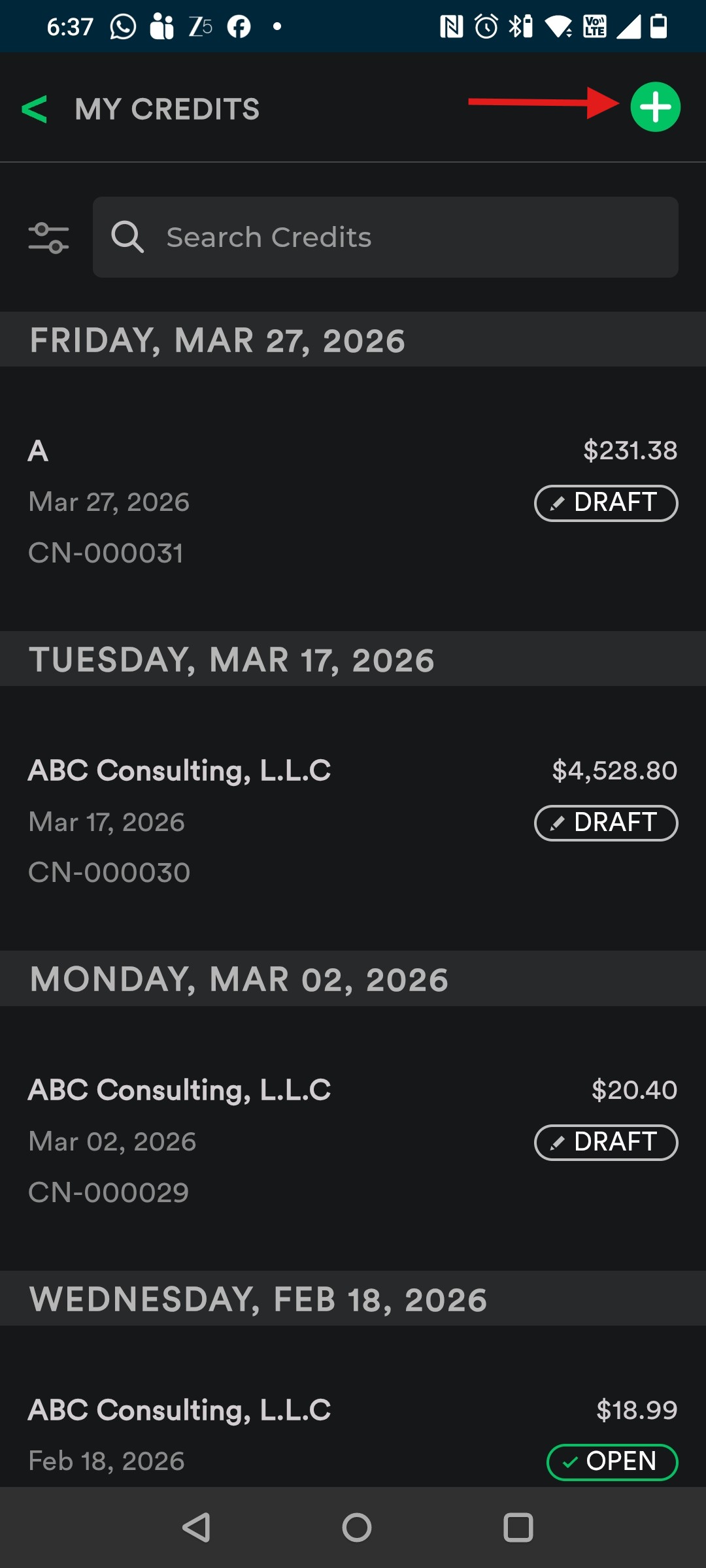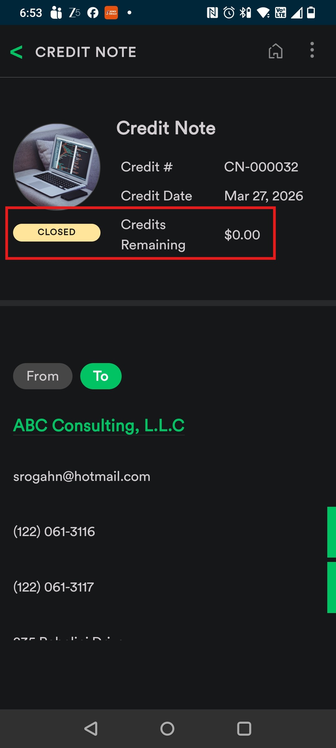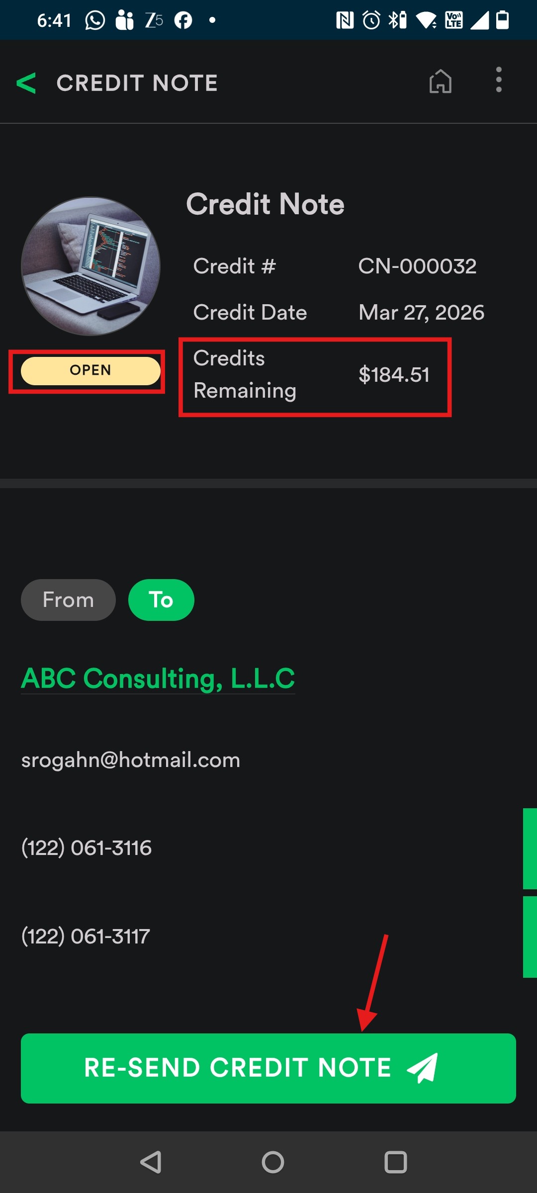 9. Once sent, the credit note status will change to “Open” with the Credit Amount.