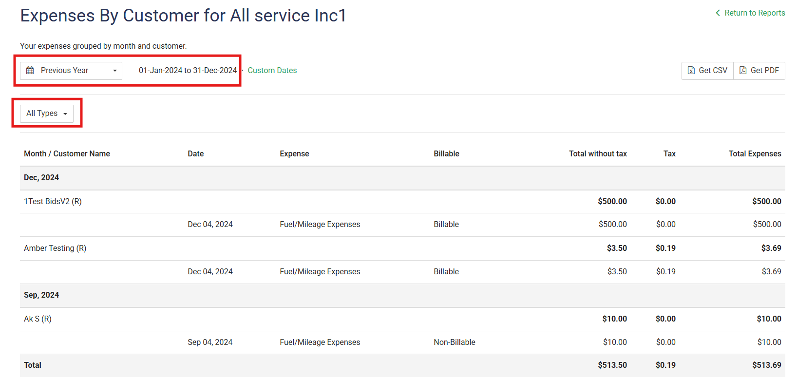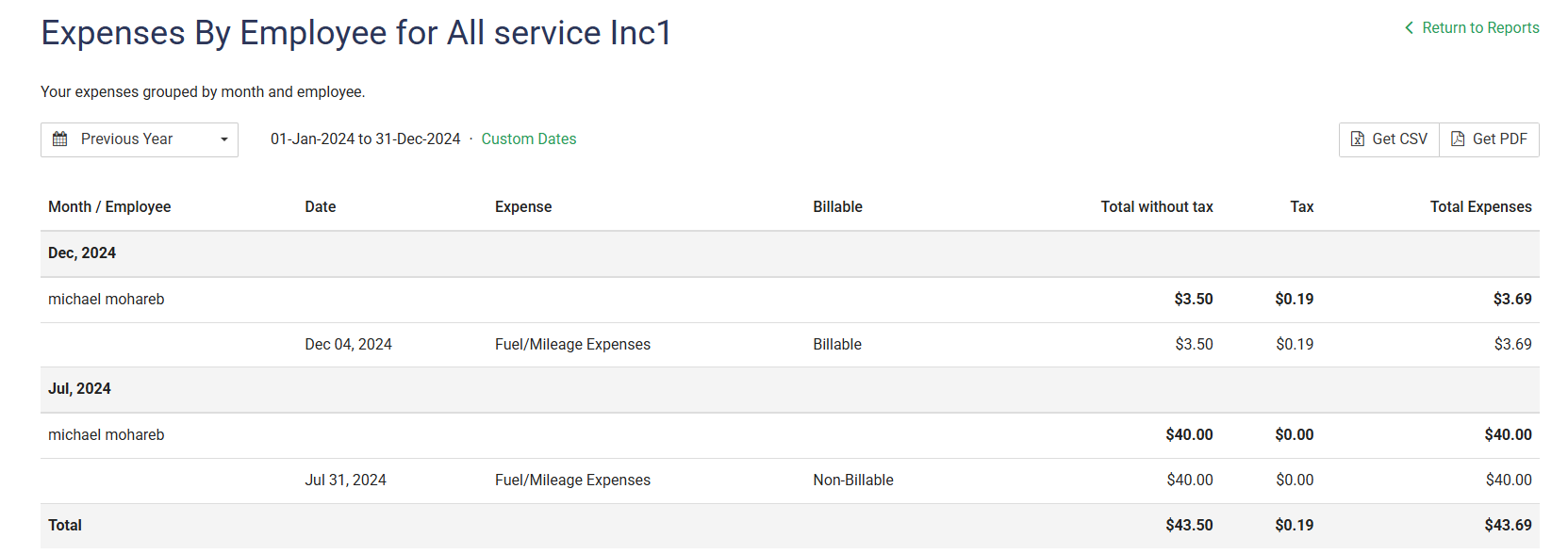 - Total Expenses: Expense Amount including Tax is displayed against the respective Date
