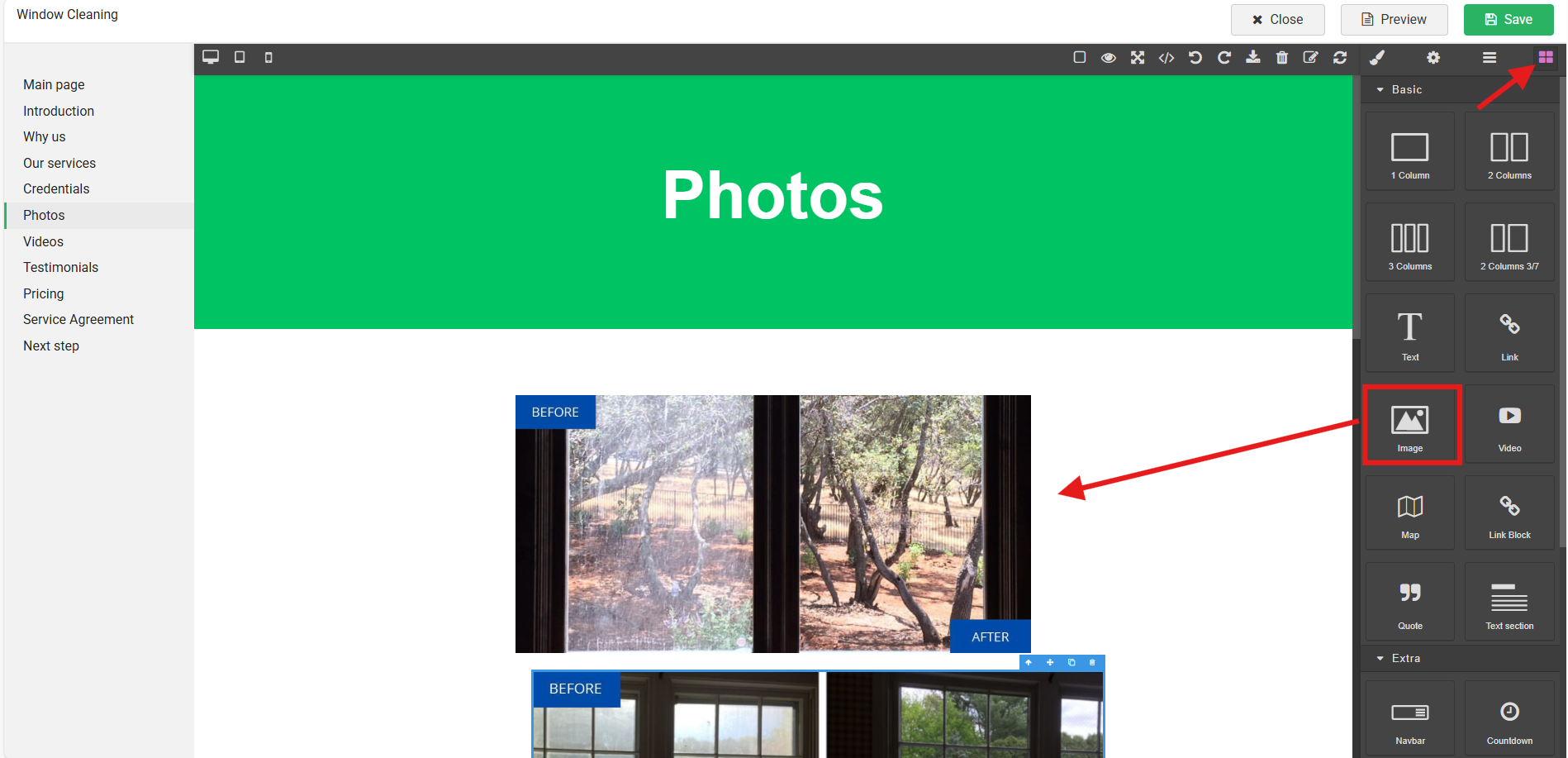 2. To add any element such as image, text or a link: Click Window icon on top right > Drag and drop to the place where you want to fit on the template. Example is shown in the image below: