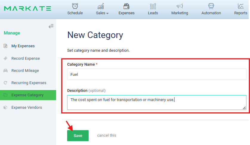 3. Enter Expense Category Name Eg: Fuel. You can also enter the description which is optional.