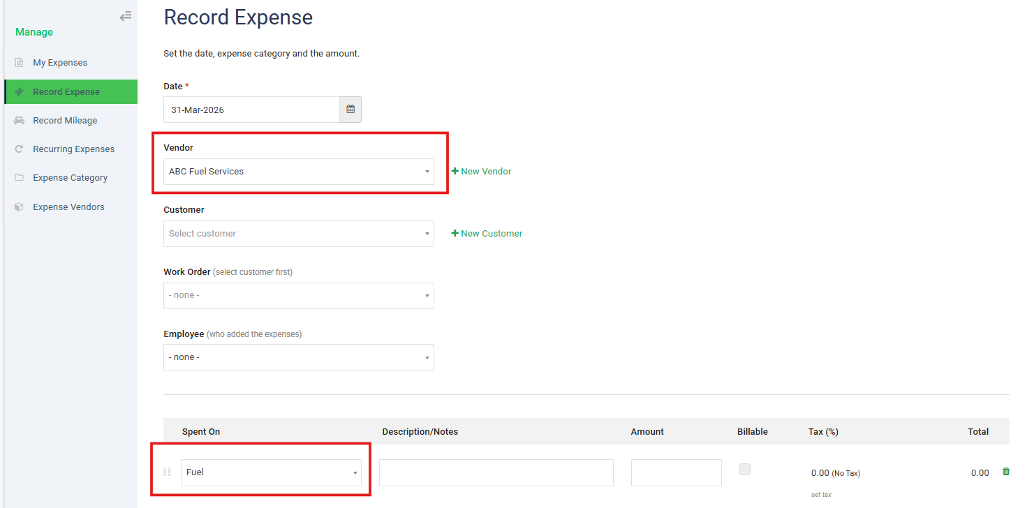 When recording an Expense, the Vendor and Category will be reflected and can be directly added from the dropdown.