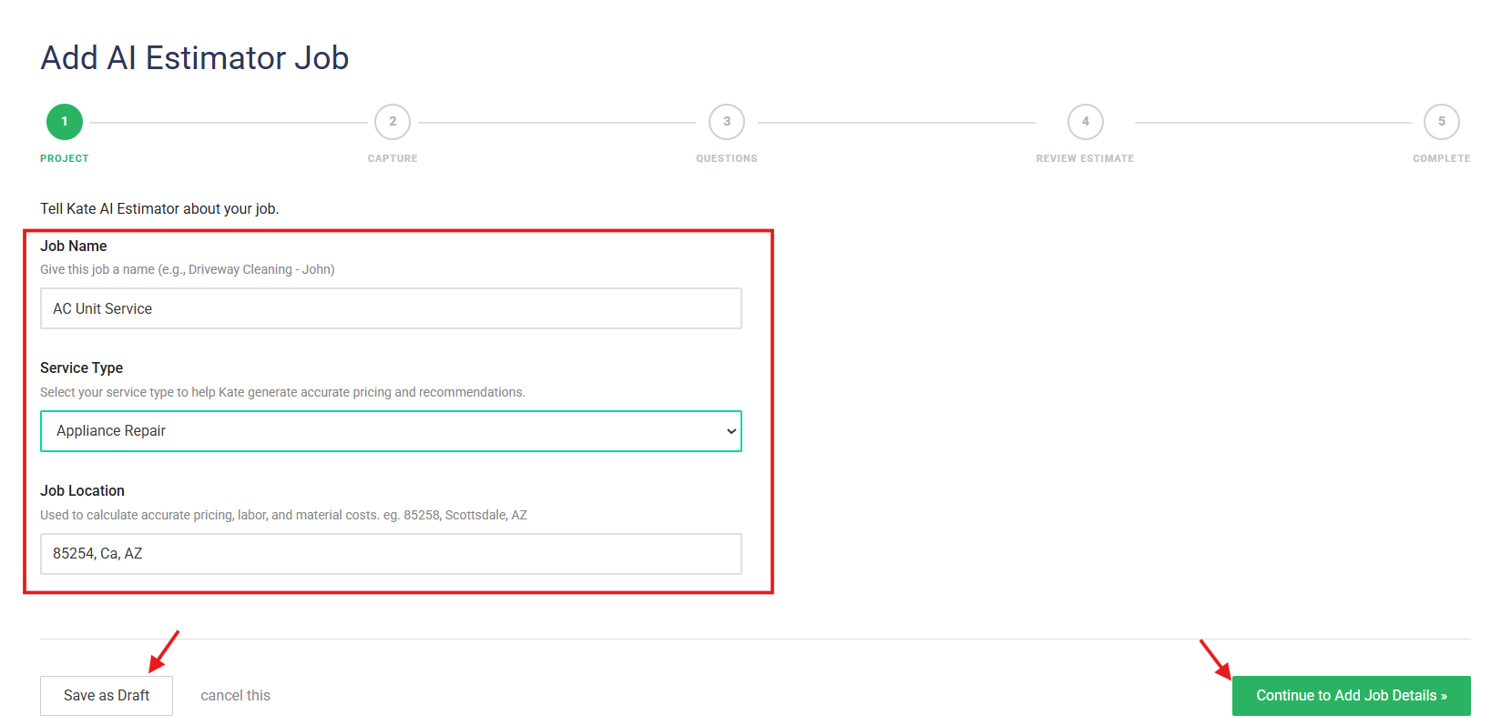 Step 11: As you start with creating AI Estimate, first- tell Kate AI about your Job. Enter 'Job Name', 'Service Type', 'Job Location'.
