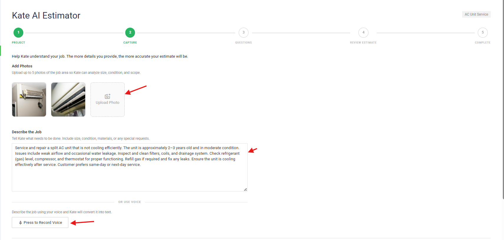 Step 13: Next, you can upload Job Area Pictures for Kate AI to estimate accurately. Also, you can describe the Job either by Typing or Recording your voice. Click 'Press to Record Voice' for recording job description.