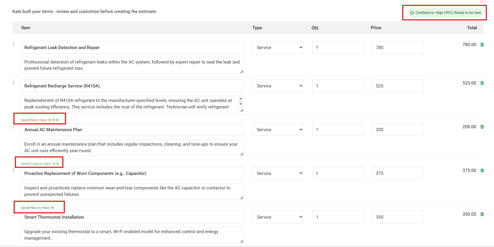 In the top right corner, you will see a Confidence Rating (e.g., "Confidence: High (90%)"). This indicates how certain the AI is that these items accurately reflect the technician's notes or the customer's request. Always perform a final manual check if the confidence score is low.