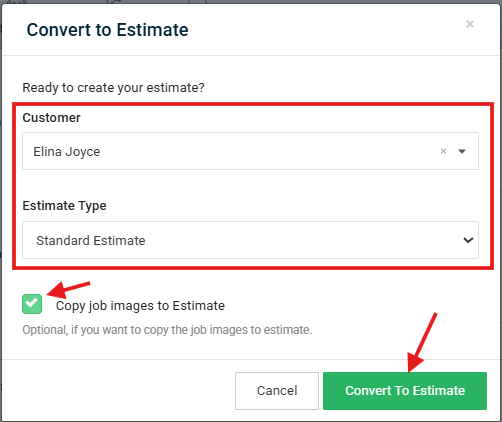 Step 20: On the next pop up, select a Customer to whom you want to send the AI Estimate, select the Estimate type (Standard or Options), Mark the checkbox- Copy job images to Estimate. It's optional. Here the pictures you uploaded for Kate AI Estimator will be copied. Click 'Convert to Estimate' button.