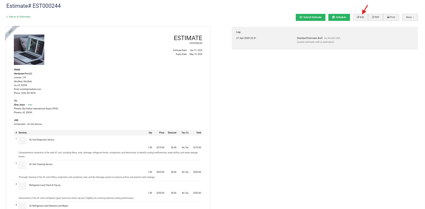Step 21: The Draft Estimate for the selected Customer is Ready. You can Submit it now or you can still edit it if required.