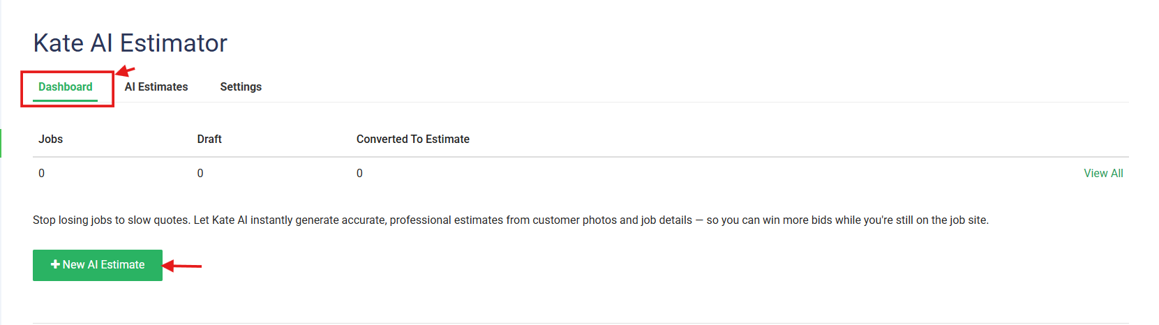 Note: On the Dashboard, you can view Number of Jobs, Draft Estimates and number of AI Estimates converted to Estimates.